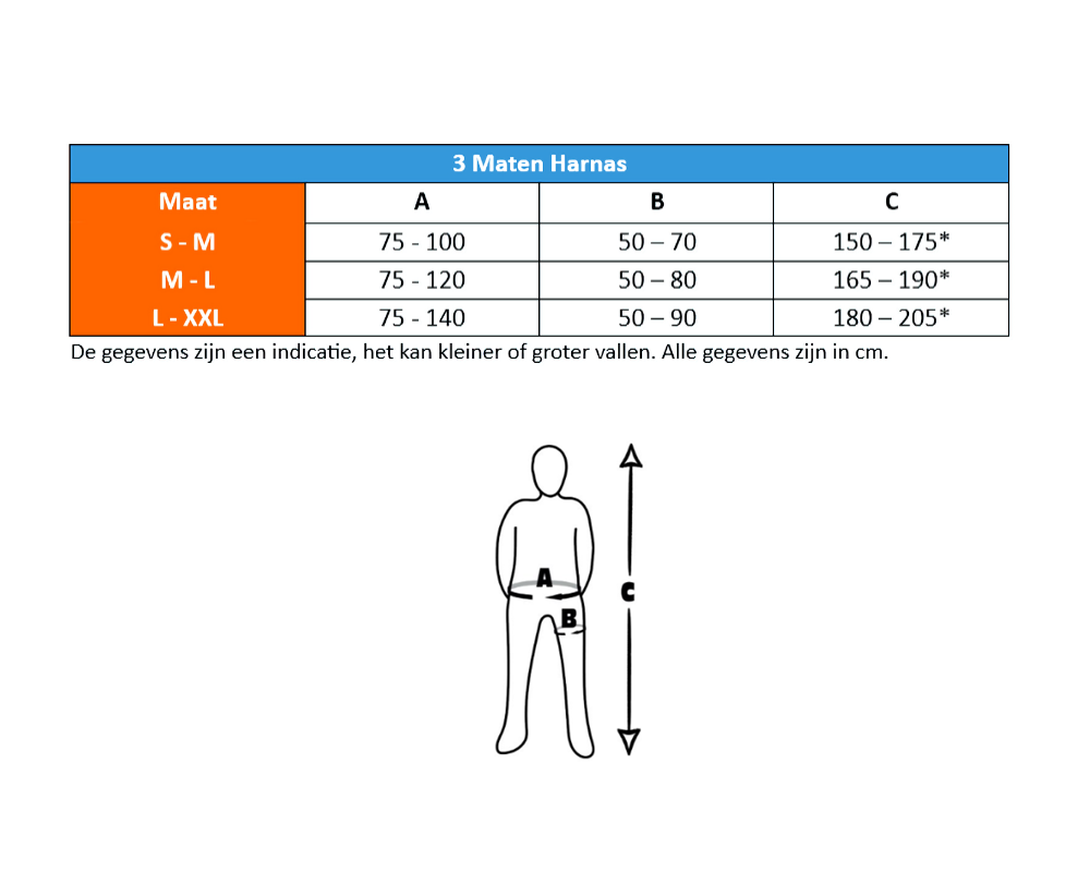 • Dit harnas is beschikbaar in de maten S-M / M-L / L-XXL. (zie maattabel).